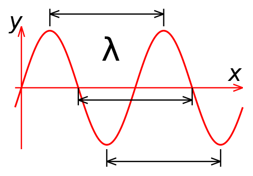 | Illustration of wavelength (represented by λ) measured from various parts of a wave. [Source: Wikipedia] |